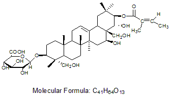 IUPAC name: (2S,3S,4S,5R,6R)-6-[[(3S,4R,4aR,6aR,6bS,8S,8aR,9R,10R,12aS,14aR,14bR)-8,9-dihydroxy-4,8a-bis(hydroxymethyl)-4,6a,6b,11,11,14b-hexamethyl-10-[(E)-2-methylbut-2-enoyl]oxy-1,2,3,4a,5,6,7,8,9,10,12,12a,14,14a-tetradecahydropicen-3-yl]oxy]-3,4,5-trihydroxyoxane-2-carboxylic acid